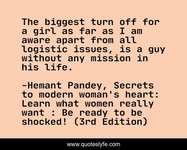 This page presents the quote "The biggest turn off for a girl as far as I am aware apart from all logistic issues, is a guy without any mission in his life.". Author of this quote is Hemant Pandey, Secrets to modern woman's heart: Learn what women really want : Be ready to be shocked! (3rd Edition). This quote is about romance, women-psychology, dating, love, affection,.