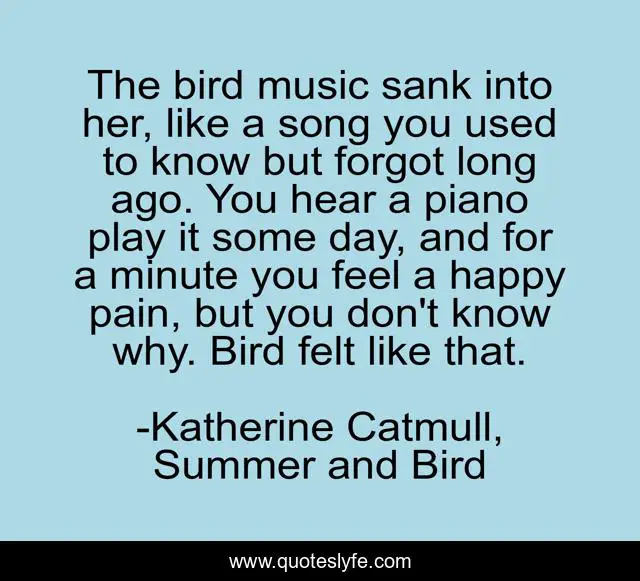 This page presents the quote "The bird music sank into her, like a song you used to know but forgot long ago. You hear a piano play it some day, and for a minute you feel a happy pain, but you don't know why. Bird felt like that.". Author of this quote is Katherine Catmull, Summer and Bird. This quote is about forgetting, music, birds, song,.