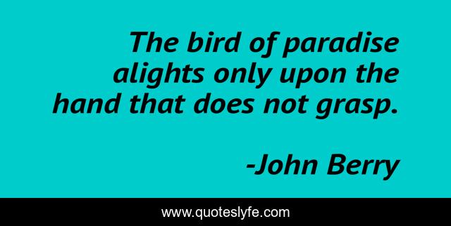 This page presents the quote "The bird of paradise alights only upon the hand that does not grasp.". Author of this quote is John Berry. This quote is about faith, life, philosophy, inspirational, enthusiasm, enlightenment, inspiration,.