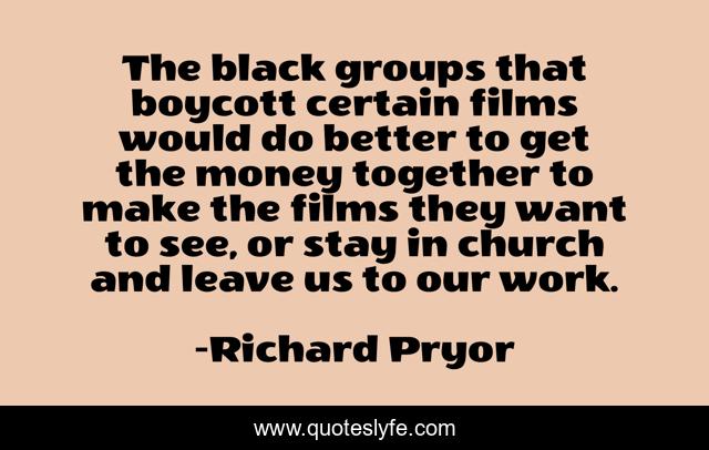 This page presents the quote "The black groups that boycott certain films would do better to get the money together to make the films they want to see, or stay in church and leave us to our work.". Author of this quote is Richard Pryor. This quote is about work, black, together,.