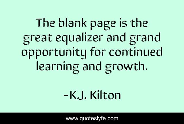 This page presents the quote "The blank page is the great equalizer and grand opportunity for continued learning and growth.". Author of this quote is K.J. Kilton. This quote is about equalizer, growth, opportunity, learning,.