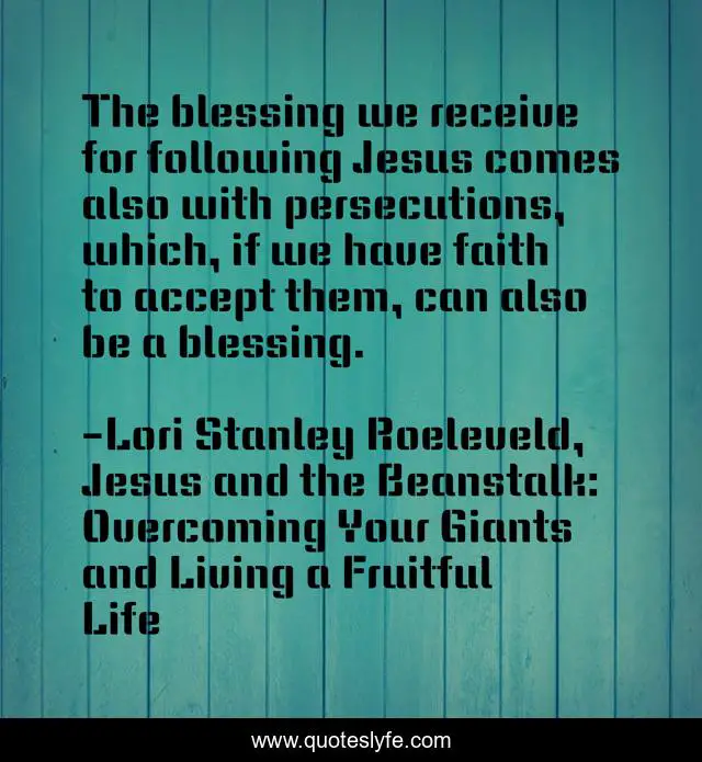 This page presents the quote "The blessing we receive for following Jesus comes also with persecutions, which, if we have faith to accept them, can also be a blessing.". Author of this quote is Lori Stanley Roeleveld, Jesus and the Beanstalk: Overcoming Your Giants and Living a Fruitful Life. This quote is about faith, jesus, inspirational, enthusiasm,.