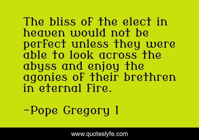 This page presents the quote "The bliss of the elect in heaven would not be perfect unless they were able to look across the abyss and enjoy the agonies of their brethren in eternal fire.". Author of this quote is Pope Gregory I. This quote is about hell, heaven,.