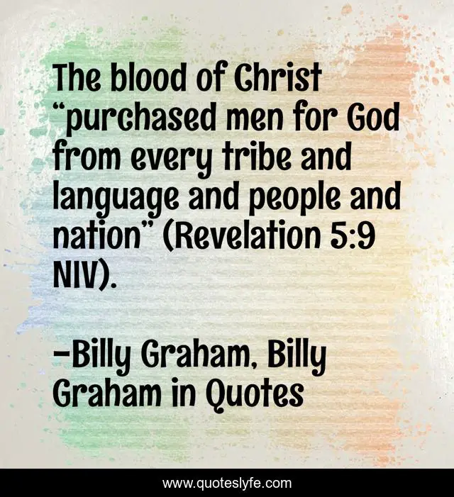 This page presents the quote "The blood of Christ “purchased men for God from every tribe and language and people and nation” (Revelation 5:9 NIV).". Author of this quote is Billy Graham, Billy Graham in Quotes. This quote is about america, billy-graham,.