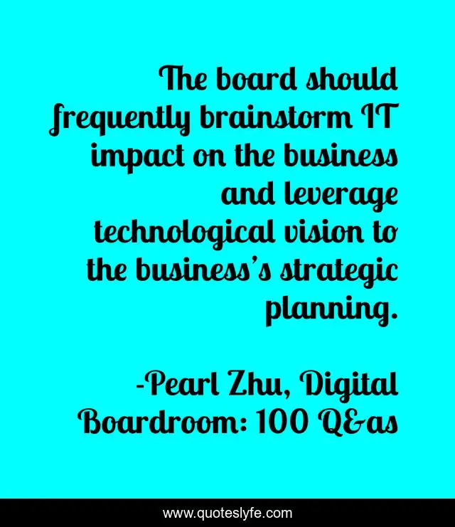This page presents the quote "The board should frequently brainstorm IT impact on the business and leverage technological vision to the business’s strategic planning.". Author of this quote is Pearl Zhu, Digital Boardroom: 100 Q&as. This quote is about boardroom, digitalization, vision,.