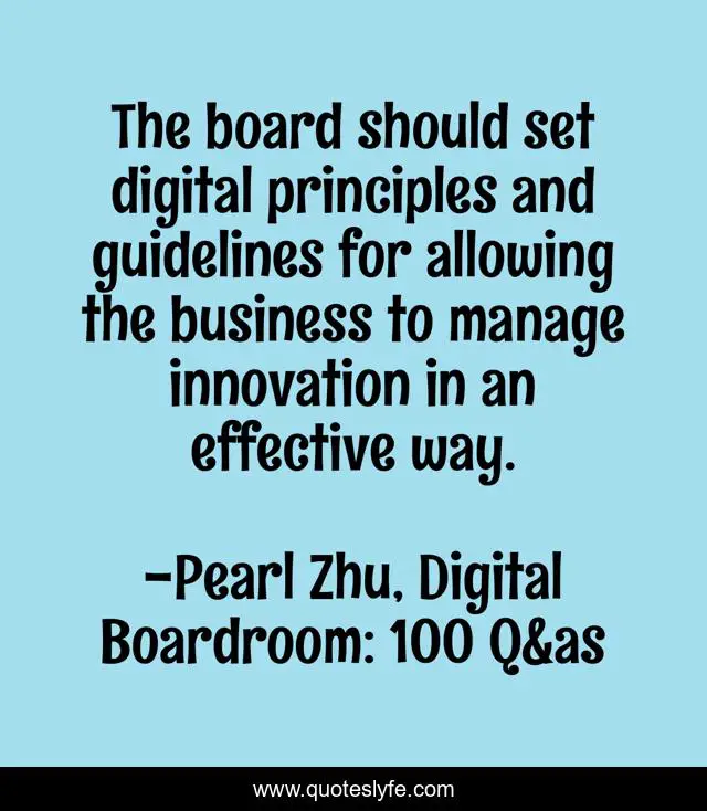 This page presents the quote "The board should set digital principles and guidelines for allowing the business to manage innovation in an effective way.". Author of this quote is Pearl Zhu, Digital Boardroom: 100 Q&as. This quote is about boardroom, digital, innovation,.