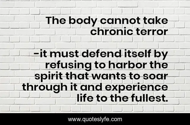 "it must defend itself by refusing to harbor the spirit that wants to soar through it and experience life to the fullest. Quotes." Quoteslyfe.com, 2025. Mon. 08 Dec. 2025. <https://www.quoteslyfe.com/quote/The-body-cannot-take-chronic-terror-139470>.