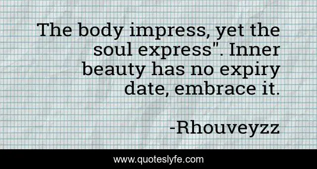 This page presents the quote "The body impress, yet the soul express". Inner beauty has no expiry date, embrace it.". Author of this quote is Rhouveyzz. This quote is about confidence, positive, motivational, impress, soul, optimistic,.