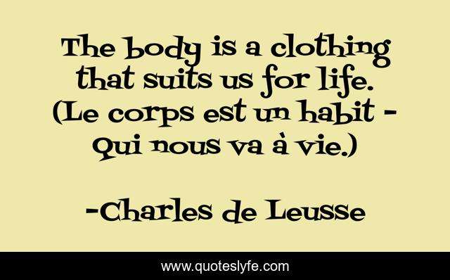 This page presents the quote "The body is a clothing that suits us for life. (Le corps est un habit - Qui nous va à vie.)". Author of this quote is Charles de Leusse. This quote is about body, life, corps, habit, vie, clothing,.
