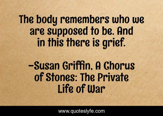 This page presents the quote "The body remembers who we are supposed to be. And in this there is grief.". Author of this quote is Susan Griffin, A Chorus of Stones: The Private Life of War. This quote is about body, grief, memory,.