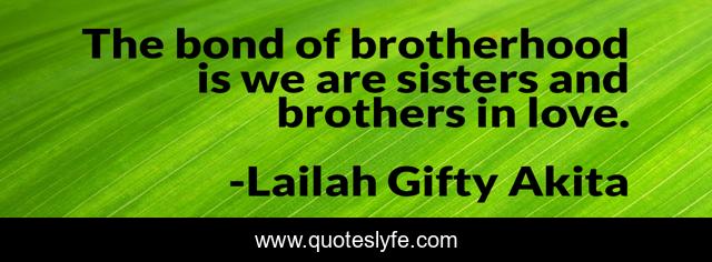 This page presents the quote "The bond of brotherhood is we are sisters and brothers in love.". Author of this quote is Lailah Gifty Akita. This quote is about faith, inspiring, christian, brothers, family, peace, co-existence, inspirational, sisters,.