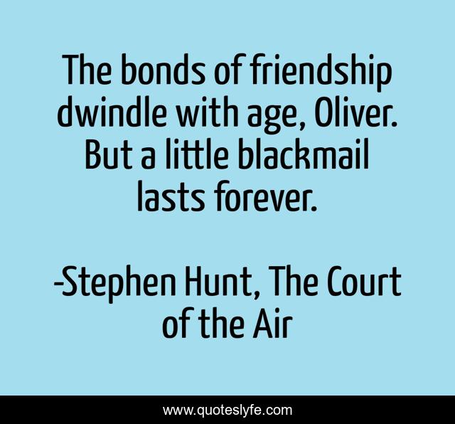 This page presents the quote "The bonds of friendship dwindle with age, Oliver. But a little blackmail lasts forever.". Author of this quote is Stephen Hunt, The Court of the Air. This quote is about friendship, humor, blackmail,.