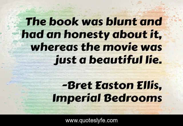 This page presents the quote "The book was blunt and had an honesty about it, whereas the movie was just a beautiful lie.". Author of this quote is Bret Easton Ellis, Imperial Bedrooms. This quote is about fiction, adaptations, writing,.