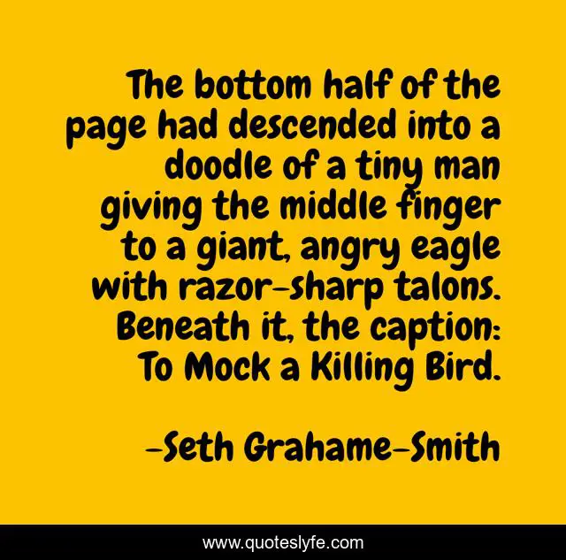 This page presents the quote "The bottom half of the page had descended into a doodle of a tiny man giving the middle finger to a giant, angry eagle with razor-sharp talons. Beneath it, the caption: To Mock a Killing Bird.". Author of this quote is Seth Grahame-Smith. This quote is about funny, vampire-hunter, comedy, abraham-lincoln,.