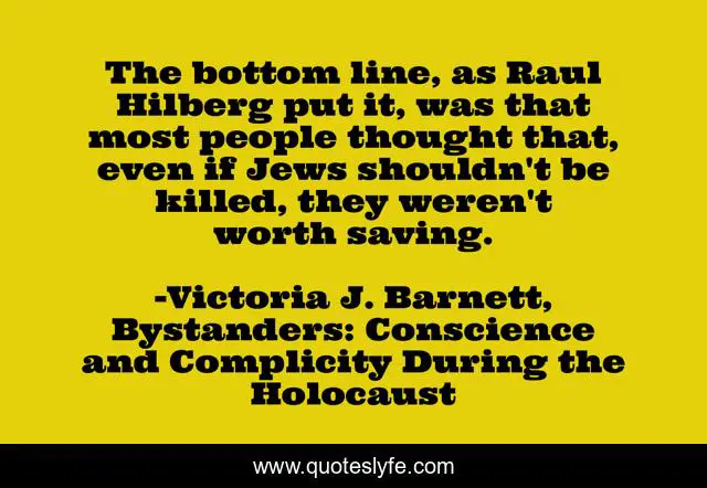 This page presents the quote "The bottom line, as Raul Hilberg put it, was that most people thought that, even if Jews shouldn't be killed, they weren't worth saving.". Author of this quote is Victoria J. Barnett, Bystanders: Conscience and Complicity During the Holocaust. This quote is about conscience, bystanderism, moral-development, holocaust, neofascism, fascism, shoah, antisemitism, morality,.
