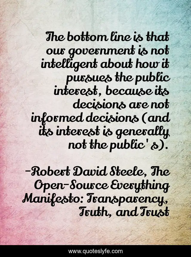 "Robert David Steele, The Open-Source Everything Manifesto: Transparency, Truth, and Trust Quotes." Quoteslyfe.com, 2025. Mon. 08 Dec. 2025. <https://www.quoteslyfe.com/quote/The-bottom-line-is-that-our-government-200239>.