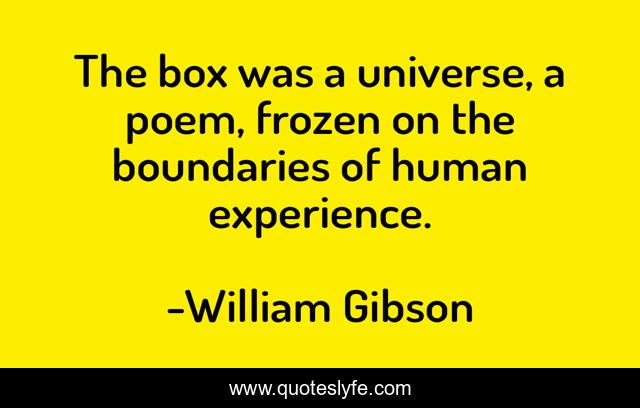 This page presents the quote "The box was a universe, a poem, frozen on the boundaries of human experience.". Author of this quote is William Gibson. This quote is about box, universe, human,.