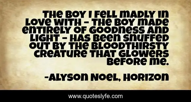 This page presents the quote "The boy I fell madly in love with – the boy made entirely of goodness and light – has been snuffed out by the bloodthirsty creature that glowers before me.". Author of this quote is Alyson Noel, Horizon. This quote is about beast, light, dace-and-daire, horizon,.