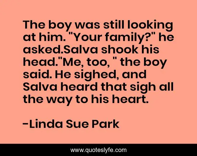 This page presents the quote "The boy was still looking at him. "Your family?" he asked.Salva shook his head."Me, too, " the boy said. He sighed, and Salva heard that sigh all the way to his heart.". Author of this quote is Linda Sue Park. This quote is about shared-pain, humanity,.