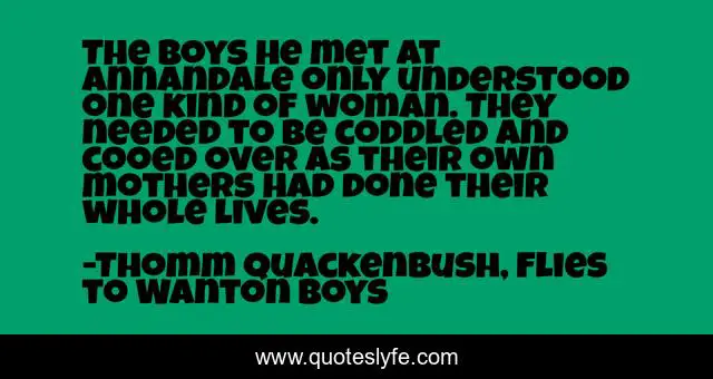 This page presents the quote "The boys he met at Annandale only understood one kind of woman. They needed to be coddled and cooed over as their own mothers had done their whole lives.". Author of this quote is Thomm Quackenbush, Flies to Wanton Boys. This quote is about mother, mom, relationship, oedipal,.