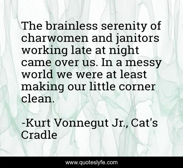 "Kurt Vonnegut Jr., Cat's Cradle Quotes." Quoteslyfe.com, 2025. Sun. 07 Dec. 2025. <https://www.quoteslyfe.com/quote/The-brainless-serenity-of-charwomen-and-janitors-73202>.