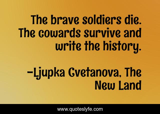 This page presents the quote "The brave soldiers die. The cowards survive and write the history.". Author of this quote is Ljupka Cvetanova, The New Land. This quote is about aphorism, quote, coward, soldiers, bravery, history,.