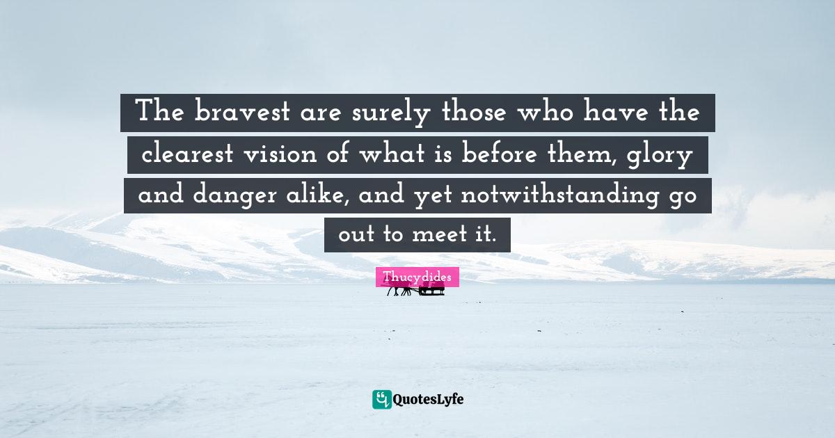 This page presents the quote "The bravest are surely those who have the clearest vision of what is before them, glory and danger alike, and yet notwithstanding go out to meet it.". Author of this quote is Thucydides. This quote is about vision, life, danger, positive, inspirational, glory,.