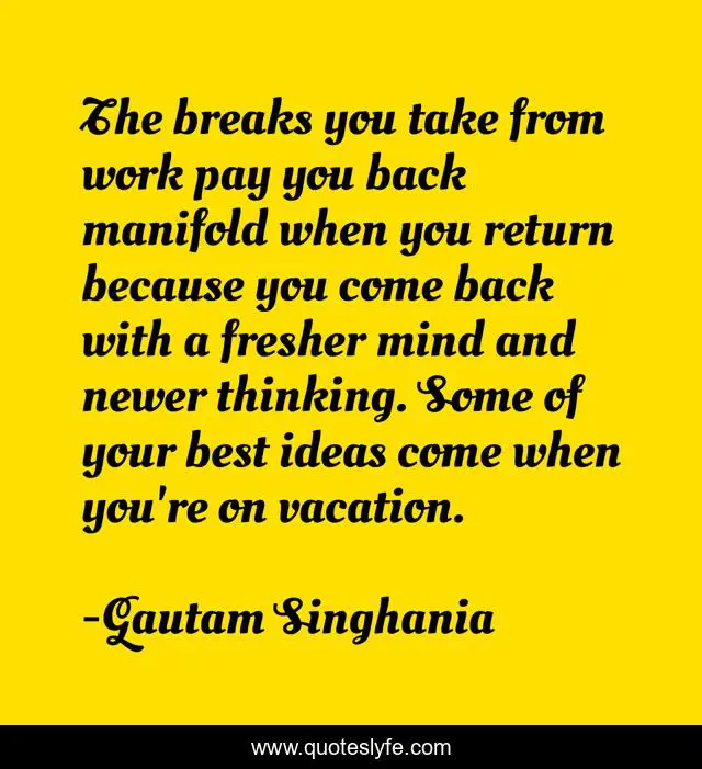 This page presents the quote "The breaks you take from work pay you back manifold when you return because you come back with a fresher mind and newer thinking. Some of your best ideas come when you're on vacation.". Author of this quote is Gautam Singhania. This quote is about mind, vacation, best,.