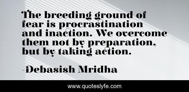 This page presents the quote "The breeding ground of fear is procrastination and inaction. We overcome them not by preparation, but by taking action.". Author of this quote is Debasish Mridha. This quote is about life-motto, philosophy, debasish-mridha, quotes, debasish-mridha-md, inspirational, how-to-overcome-procrastination, enthusiasm, fear,.