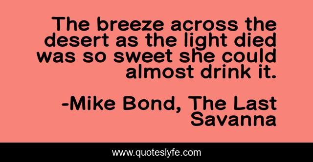 This page presents the quote "The breeze across the desert as the light died was so sweet she could almost drink it.". Author of this quote is Mike Bond, The Last Savanna. This quote is about nature, light, drink, breeze, sunset, the-last-savanna, sweet, desert, died,.