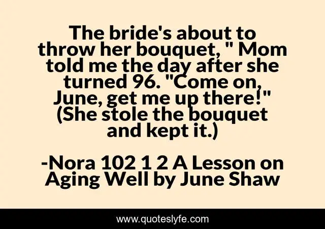 This page presents the quote "The bride's about to throw her bouquet, " Mom told me the day after she turned 96. "Come on, June, get me up there!" (She stole the bouquet and kept it.)". Author of this quote is Nora 102 1 2 A Lesson on Aging Well by June Shaw. This quote is about inspirational-life, enthusiasm, aging-well, inspirational,.