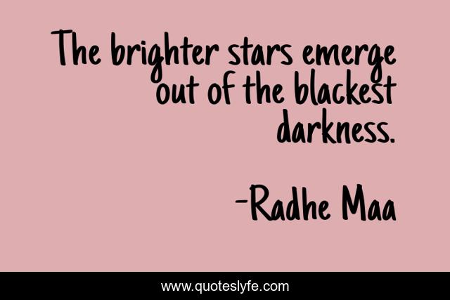 This page presents the quote "The brighter stars emerge out of the blackest darkness.". Author of this quote is Radhe Maa. This quote is about spiritual, radhe-guru-maa, spiritual-leader, radhe-maa, spiritual-sayings, wisdom, quotes-and-saying, inner-peace, spiritual-insights,.