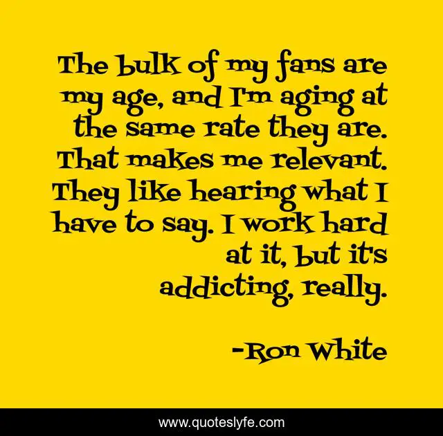 This page presents the quote "The bulk of my fans are my age, and I'm aging at the same rate they are. That makes me relevant. They like hearing what I have to say. I work hard at it, but it's addicting, really.". Author of this quote is Ron White. This quote is about me, work, work hard,.
