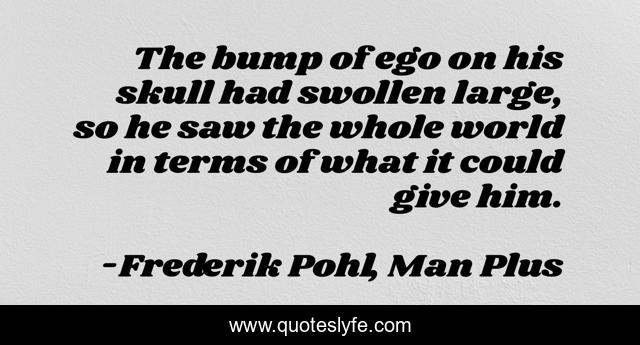 This page presents the quote "The bump of ego on his skull had swollen large, so he saw the whole world in terms of what it could give him.". Author of this quote is Frederik Pohl, Man Plus. .