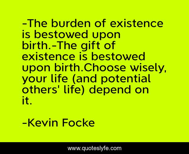 This page presents the quote "-The burden of existence is bestowed upon birth.-The gift of existence is bestowed upon birth.Choose wisely, your life (and potential others' life) depend on it.". Author of this quote is Kevin Focke. This quote is about kids, existentialism-meaning-in-life, birth,.