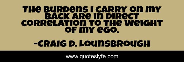This page presents the quote "The burdens I carry on my back are in direct correlation to the weight of my ego.". Author of this quote is Craig D. Lounsbrough. This quote is about selfish, egocentric, burdens, weight, ego, remorse, repentence, guilt,.