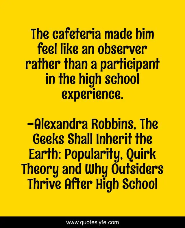This page presents the quote "The cafeteria made him feel like an observer rather than a participant in the high school experience.". Author of this quote is Alexandra Robbins, The Geeks Shall Inherit the Earth: Popularity, Quirk Theory and Why Outsiders Thrive After High School. This quote is about influence, outsiders,.