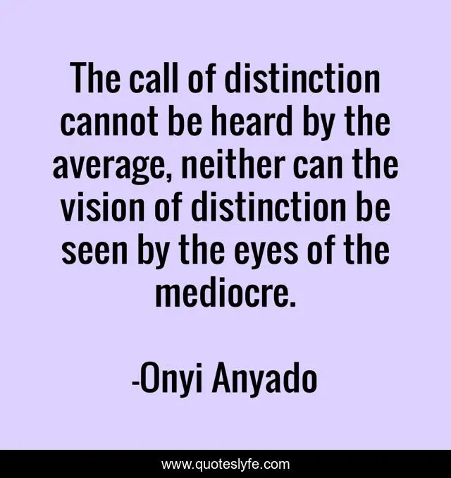 This page presents the quote "The call of distinction cannot be heard by the average, neither can the vision of distinction be seen by the eyes of the mediocre.". Author of this quote is Onyi Anyado. This quote is about brainy, quote-of-the-day, entrepreneurship, distinctive-footprints-of-life, entrepreneur, richard-branson, leadership, onyi-anyado, distinction,.