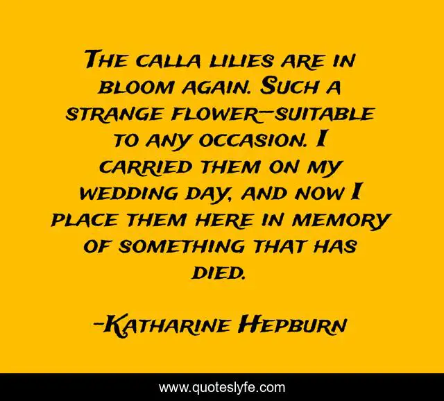 This page presents the quote "The calla lilies are in bloom again. Such a strange flower—suitable to any occasion. I carried them on my wedding day, and now I place them here in memory of something that has died.". Author of this quote is Katharine Hepburn. This quote is about death, life, flowers,.