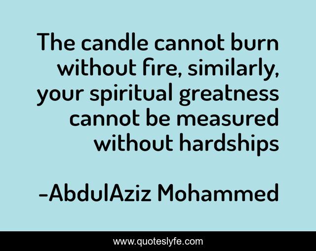 This page presents the quote "The candle cannot burn without fire, similarly, your spiritual greatness cannot be measured without hardships". Author of this quote is AbdulAziz Mohammed. This quote is about spiritual-growth, spiritual, spirituality,.
