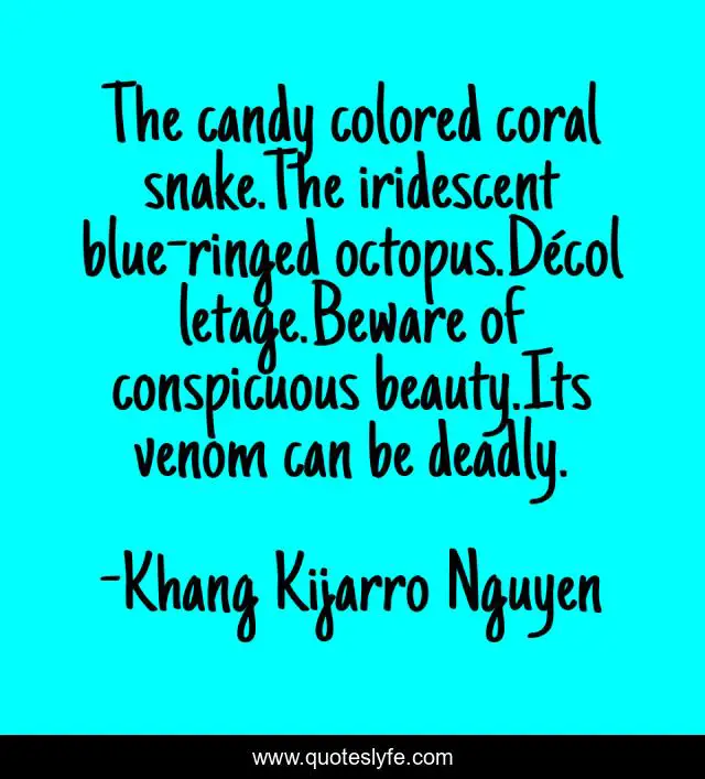 This page presents the quote "The candy colored coral snake.The iridescent blue-ringed octopus.Décolletage.Beware of conspicuous beauty.Its venom can be deadly.". Author of this quote is Khang Kijarro Nguyen. This quote is about conspicuous-beauty, deadly, venum, beauty, conspicuous,.