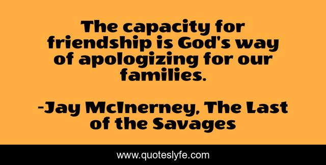 This page presents the quote "The capacity for friendship is God's way of apologizing for our families.". Author of this quote is Jay McInerney, The Last of the Savages. This quote is about friendship, humor, family,.