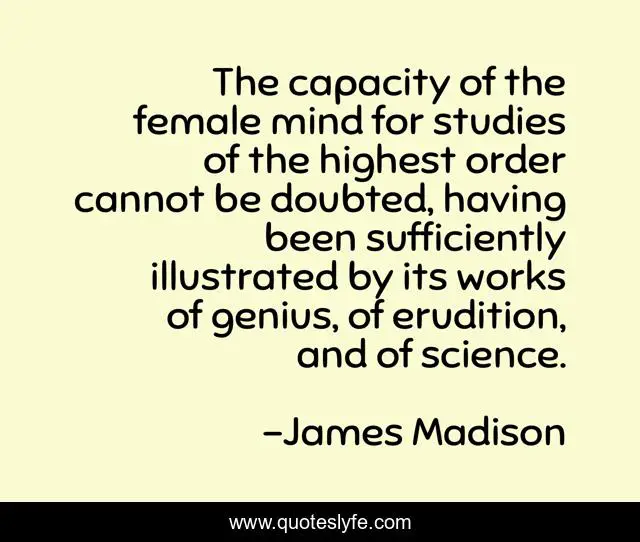 This page presents the quote "The capacity of the female mind for studies of the highest order cannot be doubted, having been sufficiently illustrated by its works of genius, of erudition, and of science.". Author of this quote is James Madison. This quote is about genius, mind, capacity,.
