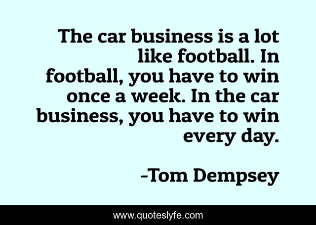 This page presents the quote "The car business is a lot like football. In football, you have to win once a week. In the car business, you have to win every day.". Author of this quote is Tom Dempsey. This quote is about football, day, business,.