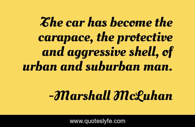 This page presents the quote "The car has become the carapace, the protective and aggressive shell, of urban and suburban man.". Author of this quote is Marshall McLuhan. This quote is about become, aggressive, man,.