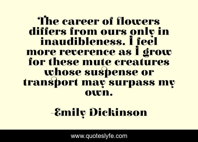 This page presents the quote "The career of flowers differs from ours only in inaudibleness. I feel more reverence as I grow for these mute creatures whose suspense or transport may surpass my own.". Author of this quote is Emily Dickinson. .