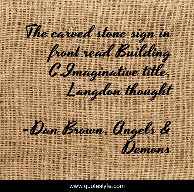 This page presents the quote "The carved stone sign in front read Building C.Imaginative title, Langdon thought". Author of this quote is Dan Brown, Angels & Demons. This quote is about building, buildings, title, stone, carved-stone, thought, titles, thoughts,.