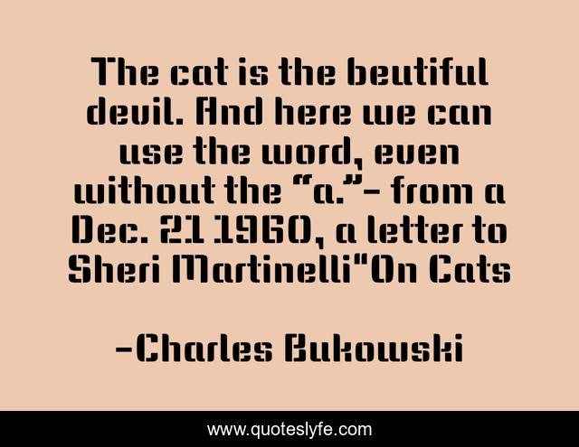 This page presents the quote "The cat is the beutiful devil. And here we can use the word, even without the “a.”- from a Dec. 21 1960, a letter to Sheri Martinelli"On Cats". Author of this quote is Charles Bukowski. .