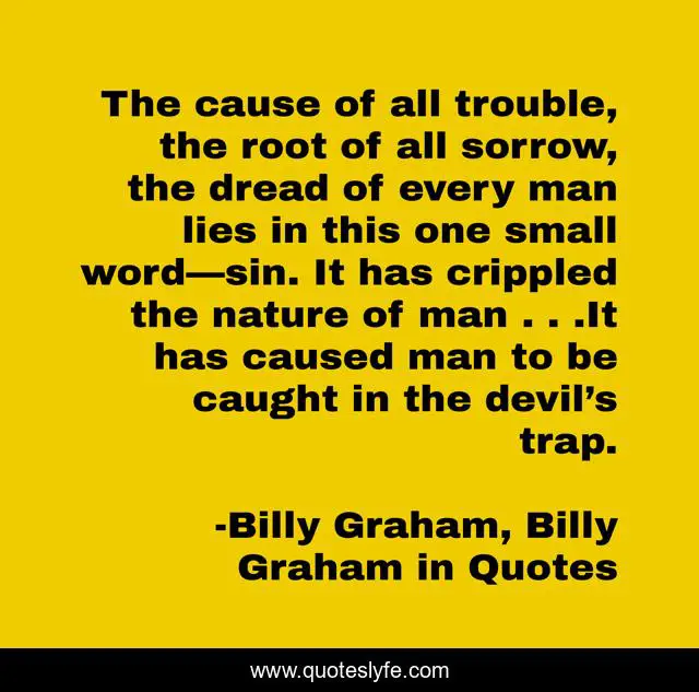 This page presents the quote "The cause of all trouble, the root of all sorrow, the dread of every man lies in this one small word—sin. It has crippled the nature of man . . .It has caused man to be caught in the devil’s trap.". Author of this quote is Billy Graham, Billy Graham in Quotes. This quote is about billy-graham, devil-s-trap, root-of-all-sorrow, sin, dread-of-every-man,.