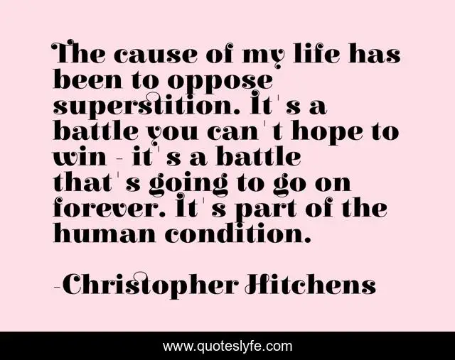 This page presents the quote "The cause of my life has been to oppose superstition. It's a battle you can't hope to win - it's a battle that's going to go on forever. It's part of the human condition.". Author of this quote is Christopher Hitchens. This quote is about battle, win, life,.